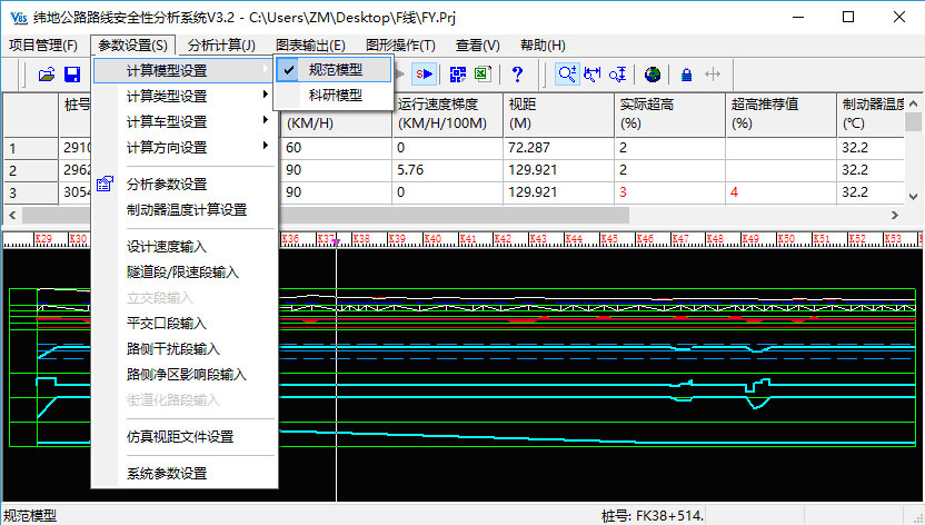 纬地公路路线安全性分析系统(HintSF v3.2)中集成了“科研模型”与“规范模型”两套运行速度预测分析模型体系,用户在计算过程中可自由切换,并可对比分析成果,以获得更符合实际项目特点的分析成果。