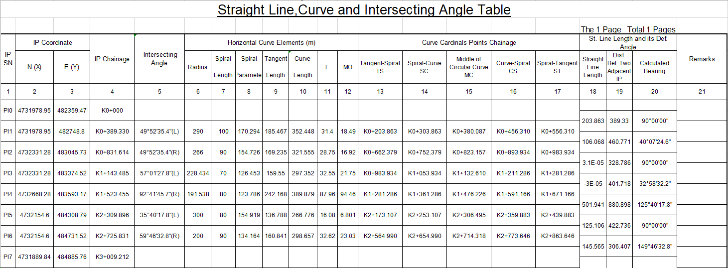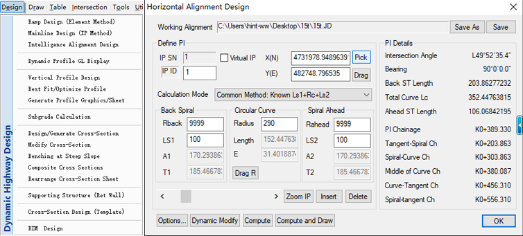 1) 提供常规路线几何设计功能,支持公路、城市道路、铁路、厂矿道路等路线平纵横几何设计与图表成果自动输出功能;