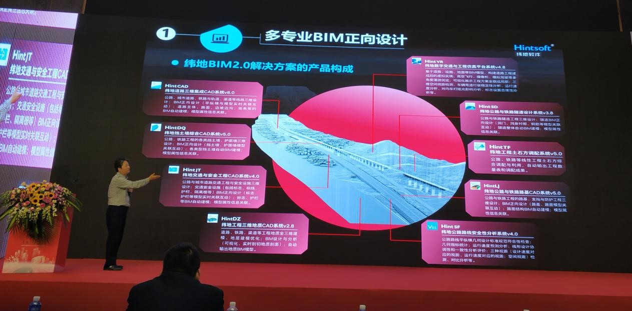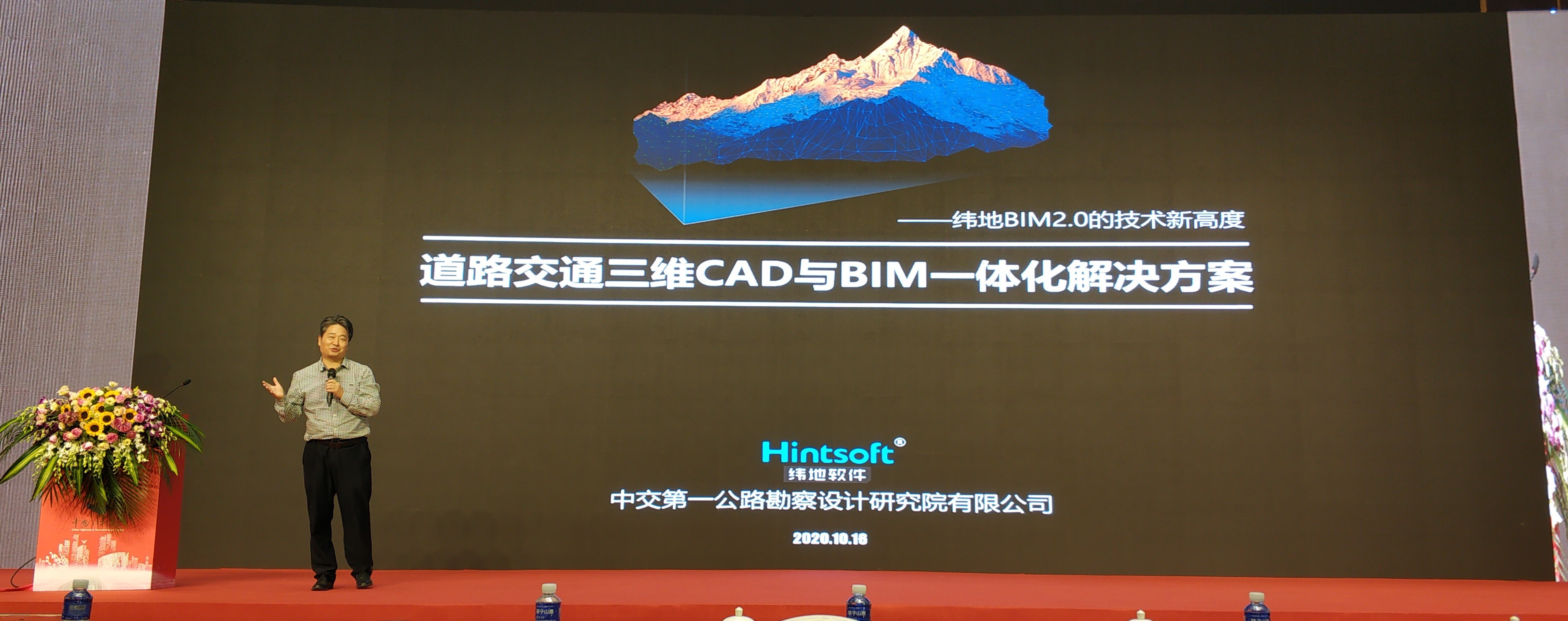 应大会邀请,中交一公院副总工程师、纬地软件技术总监郭腾峰同志压轴出场,做了《道路交通三维CAD与BIM解决方案》的专题交流发言。郭总首先向与会领导、专家和代表们介绍了交通运输部《关于公路与水运行业BIM技术应用指导意见》的背景和国内外调研情况,全面分析了目前道路交通行业BIM技术现状和落地应用中存在的各类问题;然后,从勘察设计阶段BIM应用的4个核心任务(或需求)出发,深入阐述了“纬地BIM2.0解决方案”的技术路径,并展示了“纬地BIM2.0”在“多专业BIM正向设计”和“多专业自动建模与属性关联”等方面的主要功能与建模效率。