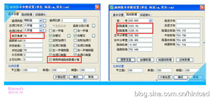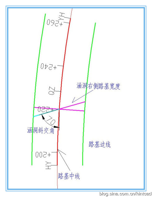 办法一:直接从图中量取。首先我们绘制出平面设计线,然后将曲线向路基两侧偏移对应的路基宽度(当然,我们也可也直接绘制出路面标高图或连接部图);然后按照涵洞的斜交角绘出涵洞中心线并延伸至路基边线,至此,我们就可也准确量取斜交涵洞对应桩号的左右幅路基宽度了。