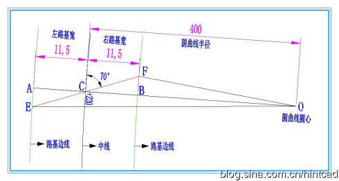 由路线信息可知:左路基宽CA=11.5m,右路基宽CB=11.5m,OC=R=400m,通过简单的几何关系可求出:OF=OB=R-CB=400-11.5=388.5m,OE=OA=R+CA=411.5m,