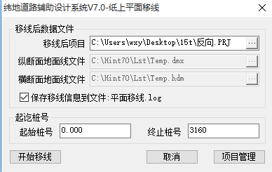 2打开原始数据,点击工具下的“平面移线”命令,在弹出的对话框中(图2),将反向后的新建项目作为移线后项目,桩号区间为全线起终点桩号,设置好后点击开始移线按钮,根据系统提示“横向搜索宽度<50m>”设置为0即可(由于平面线位仅仅是对桩号做了反向处理,并未移线,所以横向搜索宽度设置为0)。