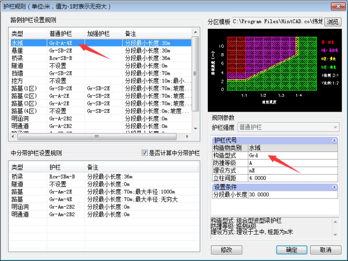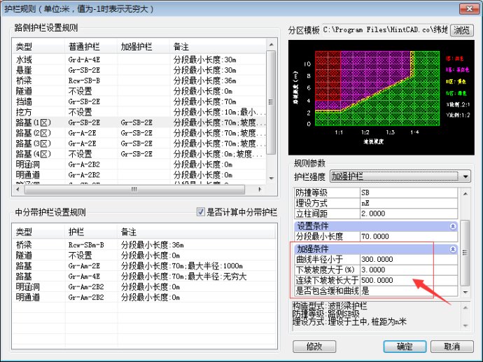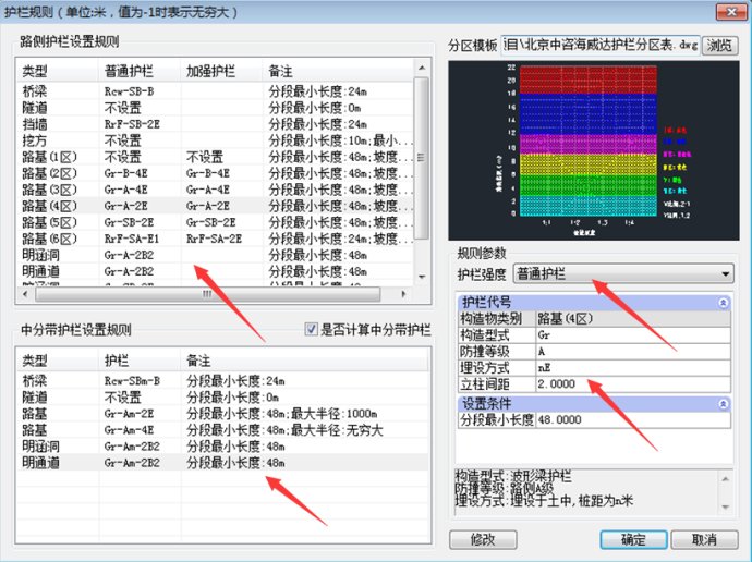 关于护栏分区表的修改和设置方法,可以参考2017.2.17号发布的一篇秘笈:“公路护栏分区表设置秘笈分享”中的相关说明。