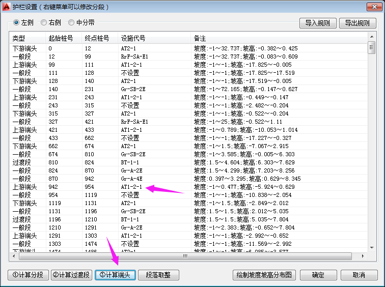 点击“②计算过渡段”,在弹出的对话框中对护栏过渡段的设置规则进行定制修改。