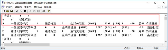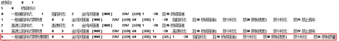 首先打开标志自动布设模板文件,在桥梁标志自动布设模板下系统已内置4种模板。将第二行桥梁自动布设标志种数改为5,然后在第4个模板数据终止位置点按回车键跳至下一行,即可新增一行,在这一行输入4Tab→一般道路样式带限速限载Tab0Tab4Tab→金鸡关隧道Tab[NAME] Tab2247Tab[LEN] Tab60Tab[XSD] Tab10Tab[XZL] Tab1Tab-20Tab→指路标志Tab→路18 桥梁隧道|Tab→禁令标志Tab→禁38 限制速度|Tab→禁令标志Tab→禁36 限制质量,具体数据如下图6所示: