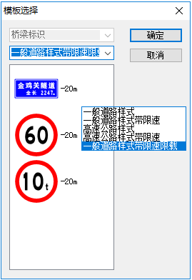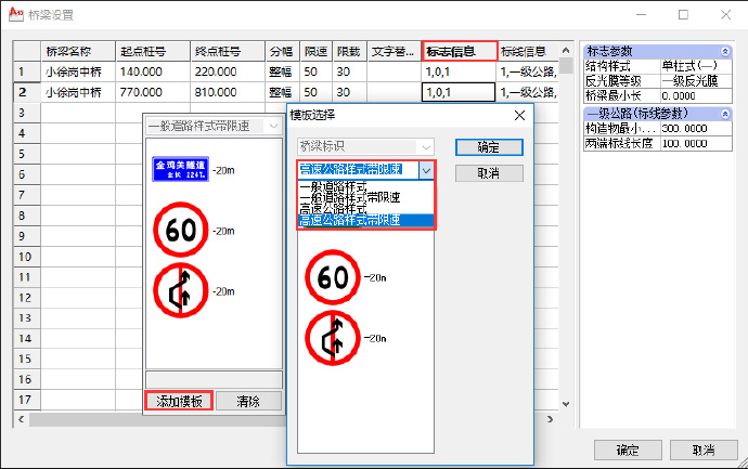 数据输入完成后,保存标志自动布设模板文件,然后启动纬地交通工程软件,在桥梁自动布设设置窗口添加模板,可以看到模板列表已经新增了“一般道路样式带限速限载”的模板样式,如下图7