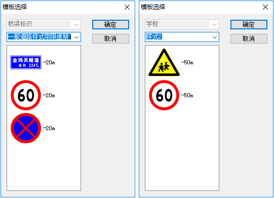 用户可根据项目实际情况编辑标志自动布设模板数据文件,以实现快速布设标志的需求。如下图9为其他类型的桥梁带限速禁止停车和学校带限速的自动标志布设模板: