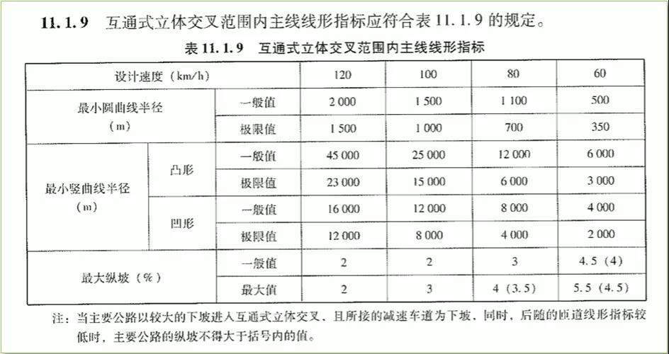 关于互通式立交范围主线指标采用与掌握,我认为,按照《规范》对用词用语(程度用语)的界定,第11.1.9条“互通式立体交叉范围内主线线形指标应符合表11.1.9的规定”,即在各类项目设计中,通常情况下互通式立交范围主线的几何指标应满足表11.1.9的要求,包括新建或改扩建的高速公路项目。