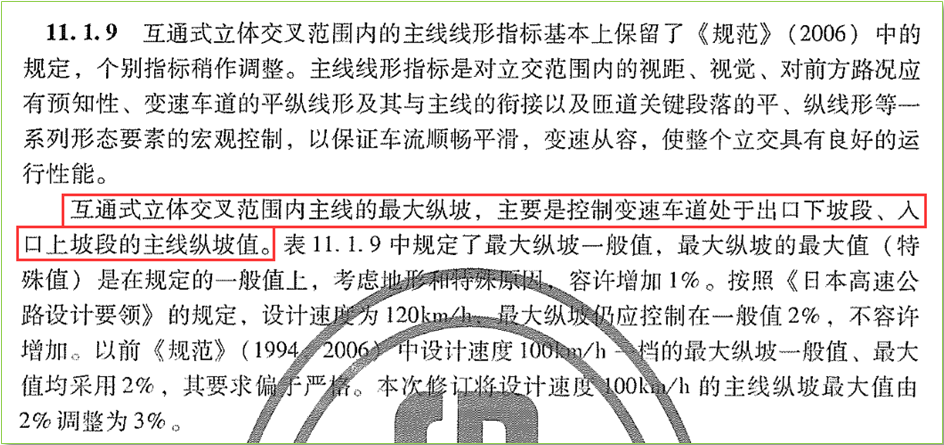 《路线规范》互通立交章节11.1.9规定了互通式立体交叉范围内主线的线形指标,比如在100km/h,主线最大纵坡一般值为2%,最大值3%。条文解释11.1.9中“互通式立体交叉范围内主线的最大纵坡,主要控制变速车道处于出口下坡段、入口上坡段的主线纵坡值”。是否可以理解为: