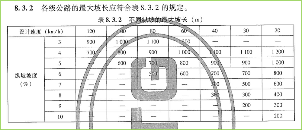 作为等级公路,为了保证公路具备基本的通行能力和服务水平(如每天、每小时能通过多少辆车),公路设计时不能只满足汽车能通过,而且必须要使得车辆以达到一定的通行速度(最低容许速度)条件下通行。这样,当车辆在经历一个陡坡的最大坡长之后,典型载重汽车的通行速度已经很低了,明显就不能满足公路设计的基本条件了。这也是《规范》为什么有第8.3.3条缓坡设置要求和第8.3.4条平均纵坡要求的原因。因此,当用到表8.3.2中某个坡度对应的最大坡长之后,接着就不能再直接使用另一个最大坡长了,而应该设置一个足够长度的缓坡,使得车辆的速度能够再次提升起来。