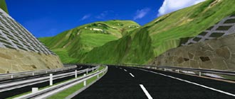 该系统基于DTM和平、纵、横设计数据,即刻生成地面、道路、桥梁、隧道等的三维真实模型,采用OpenGL赛车游戏开发技术,用户可自由填加汽车、树木、标志等,也可随意定制物体的表面色彩纹理,实时进行任意位置、视点、高度、速度的三维全景行车(或飞行),完全摆脱3DMAX等的专业制作。