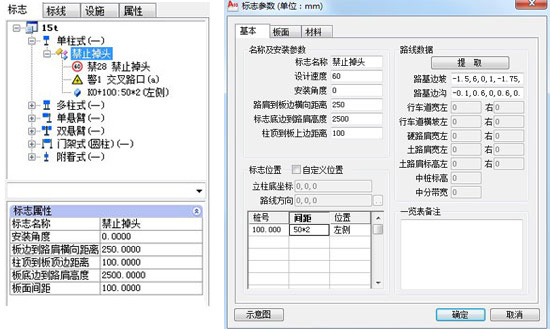 【标志设计功能】提供多种结构形式的交通标志设计,如单柱式、多柱式、单悬臂式、双悬臂式、门架式、附着式等各种常见的结构形式,自动计算标志结构的工程数量;在进行标志牌添加时,提供批量快速添加同类型标志牌的功能,避免了添加同类型标志牌的反复操作过程;实现平面设计图与数据互相关联,使得数据与图形联动,使市政道路标志设计简单快捷;提供标志自动布设功能,可对桥梁、隧道、弯路、陡坡、村庄、学校、铁路道口等特征段进行标志自动布设,使标志的自动设计内容更加丰富。