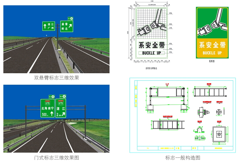 对于项目全线的标志布设,系统可一次性批量快速添加同类型标志,并可批量导入excel数据格式各类标志,可将已完成标志存为模板直接调用,可在不同标志间快速交换结构参数,极大地提高了设计效率。可自动输出标志安装图、结构图、平面布设图、版面大样图以及标志一览表、工程数量表等。