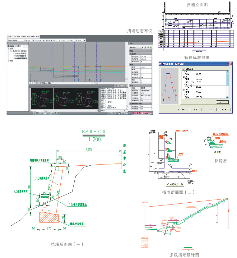 纬地公路与铁路路基设计系统,可直接读取道路路线几何设计的基础数据信息,避免用户重复进行数据(路线平、纵、横以及边坡、超高加宽等信息)录入、以及可能出现的基础数据计算和差错;系统基于智能横断面设计及模板技术可灵活实现国内外各类公路、铁路项目的这种路基设计需求;采用自学习式数据库设计,系统自动学习并追加挡土墙数据库,使得用户可以方便地应用其他项目中曾经应用过的支挡构造物的型式和数据。系统可通过直观地鼠标拖动方式,使用户可以可视化进行挡土墙布置设计、动态交互式修改与调整。设计完成之后,可批量绘制路基横断面图及挡土墙(以及各类支挡构造物)的平、立面图及典型横断面图,根据用户指定的表格模版自动计算、统计并输出所有圬工数量与材料数量。值得说明的是,系统还配有专业的支挡构造物结构分析和验算模块,适用于常规结构的挡土墙验算。