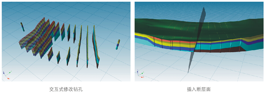系统拥有多种交互式建模工具,自动建模完成后可快速编辑各个控制钻孔(钻孔属性匹配、钻孔属性修改、钻孔删除)以及输入断层,以构建出更符合实际的地质三维模型。