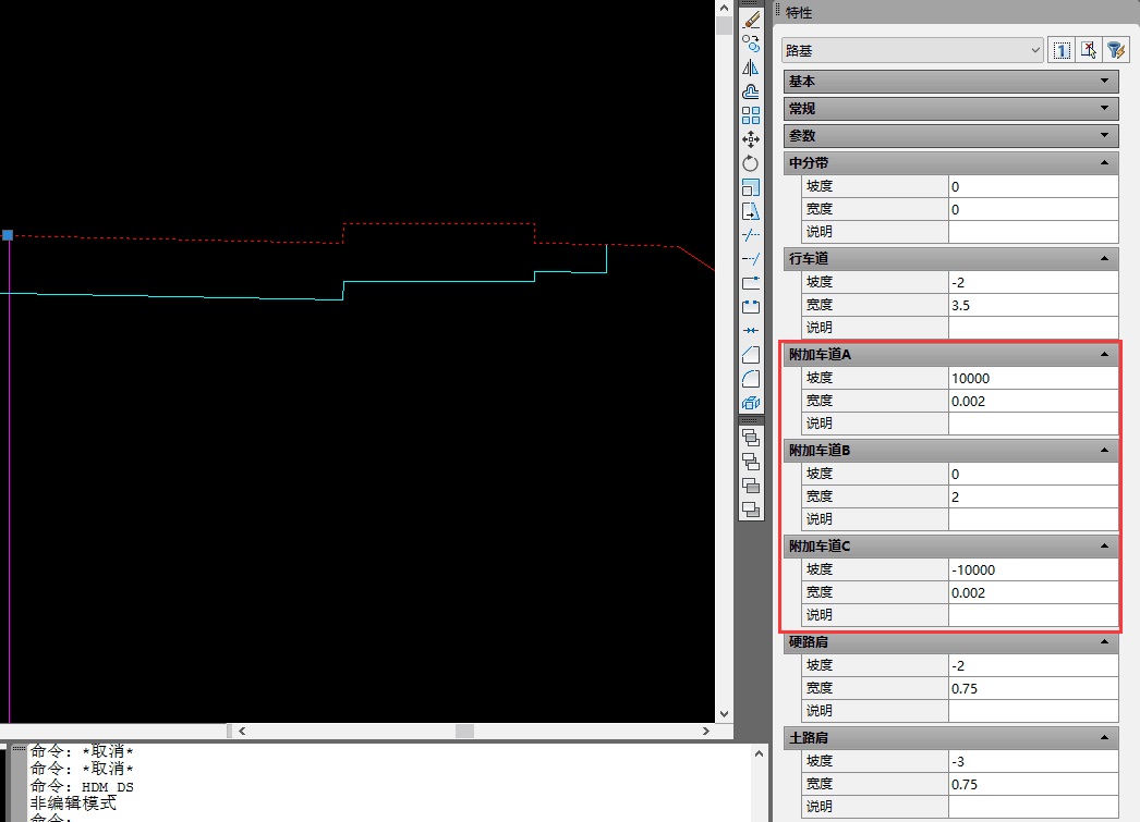 你好!已经安排技术工程师和你联系解决问题了。你编写的附加板块数据主要是用于“横断面设计绘图”功能模块的,在“横断面设计”模块中暂时不支持附加板块数据的提取。在“横断面设计”模块中,你可以通过在标准断面上设置附加车道A B C的数据、并且通过利用硬路肩和土路肩数据来定制成城市道路多板块的样式(如附图所示),带帽完成后,可以通过定制对应的横断面绘图模板来绘制出对应样式的横断面图。
