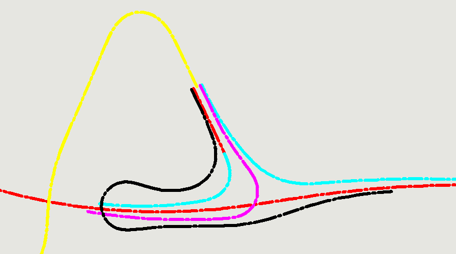 你好!对于你来信中的半定向匝道(黑色线条表示的匝道)的情况,我认为应该按照环形匝道来处理,尤其是在匝道出现回头的区域内。