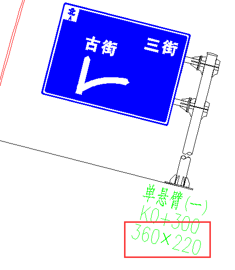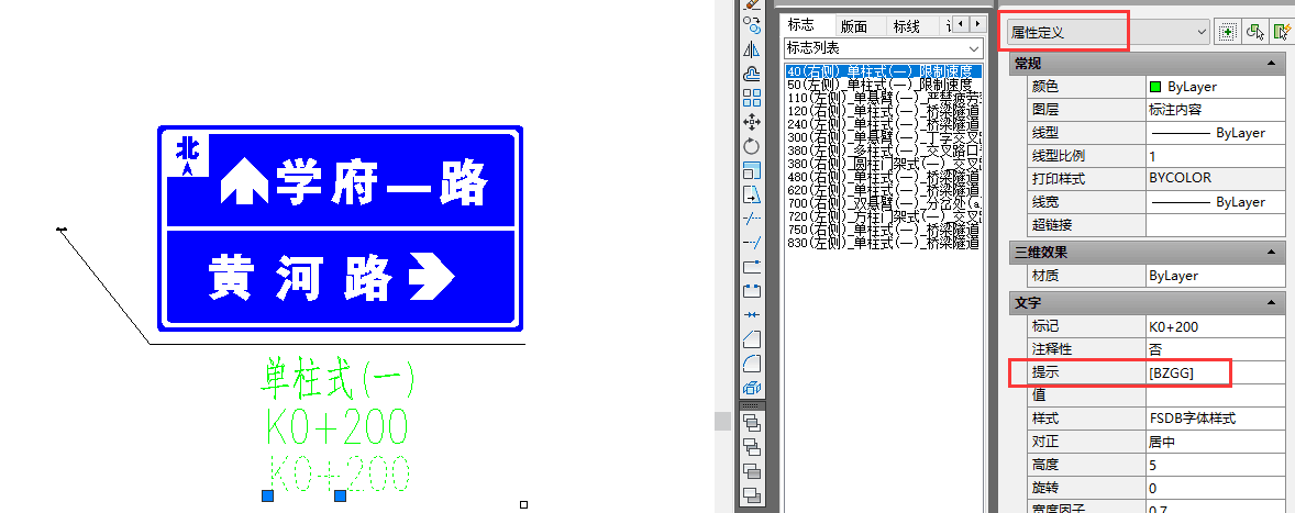 打开如图1所示的交通工程安装目录中、系统参数文件夹里的标志平面图布设样式,将标志图中的文字(如K0+200)拷贝一个出来,在属性栏将该标注文字关键字改为[BZGG],保存后关闭,再绘制标志平面布设图,即可标注出你所需要的版面尺寸(如图2)。