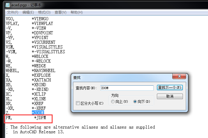 2、打开*.pgp文件后,定位至cad命令简化部分(可查找“ZOOM”,定位至最后),分别录入您需要设置的简化命令,及完整命令(严格按照上面格式,包括空格、逗号、*等)。录入好后保存文件。